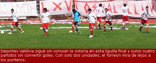 En un partido complicado y con pocas ocasiones de gol, Deportes Valdivia igualó sin goles frente a Iberia de Los Ángeles por la quinta fecha de la Liguilla de Ascenso y continúa alejándose de los lugares de avanzada en su lucha por retornar al fútbol profesional. De hecho, a estas alturas, conseguir este objetivo se ve muy complicado, toda vez que el “Torreón” sigue como exclusivo colista del octogonal final con tan solo dos puntos, y lo que es peor, prolongando una sequía goleadora prolongada que se extiende por cuatro partidos.