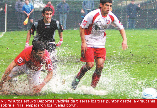 La cancha claramente estaba llamada a condicionar el juego, el Torreón comienza atacando contra el sector “Cordillera” completamente anegado, con groseras pozas de agua que frenaban cualquier intento de toque y fútbol; como comprenderán simplemente un potrero sureño, una lástima el clima y no hay más alternativa que aceptarlo o invertir sumas de dinero para drenajes correctos, pero con la cantidad de agua que cae en nuestro sur, todo se hace más difícil. De esta forma la fricción fue la tónica y donde no quedaba más que esperar una falta para tirar algún centro llovido o un tiro de esquina para poder inquietar a la saga de Unión Temuco. Pese a todos estos inconvenientes Valdivia dominó las acciones, a base de una solidez defensiva y simpleza en el juego.