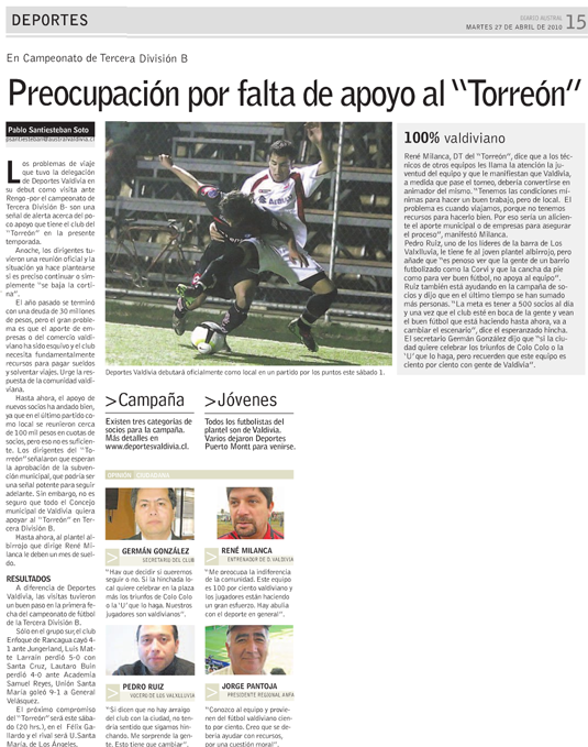 Nota del Diario Austral de Los Ríos, el Martes 27 de Abril del 2010, pagina #15 (click para agrandar).