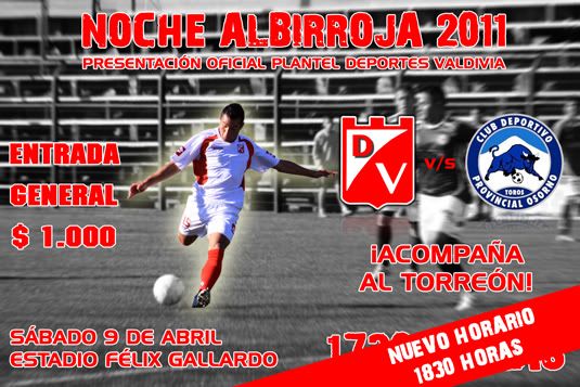 Noche albirroja desde las 18:30 hrs aguantecallecalle.com 6.4.11 Destacados Deportes Valdivia v/s Provincial OsornoSábado 9 de abril 18:30 hrsEstadio Felix GallardoEntrada general : $1000 Destacados